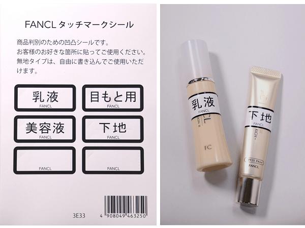 サイズ感が同じである化粧液、乳液を区別するため、乳液には「タッチマークシール」を貼っています。