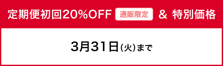 - ・定期便初回20%OFFは、こちらのページの対象商品の定期便にご登録がないお客様(過去に登録があったお客様も含む)が対象となります。現在ご登録のある方は対象外となります。また、お一人様各1点1回限りとなりますので、ご了承ください。