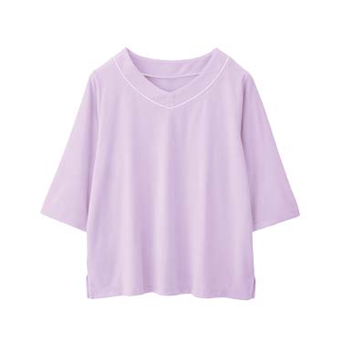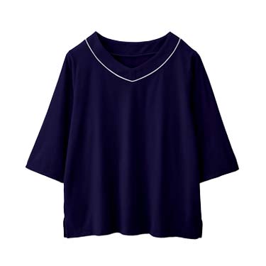 - ■深すぎないVネックで首もとすっきり。パイピングがアクセントに。